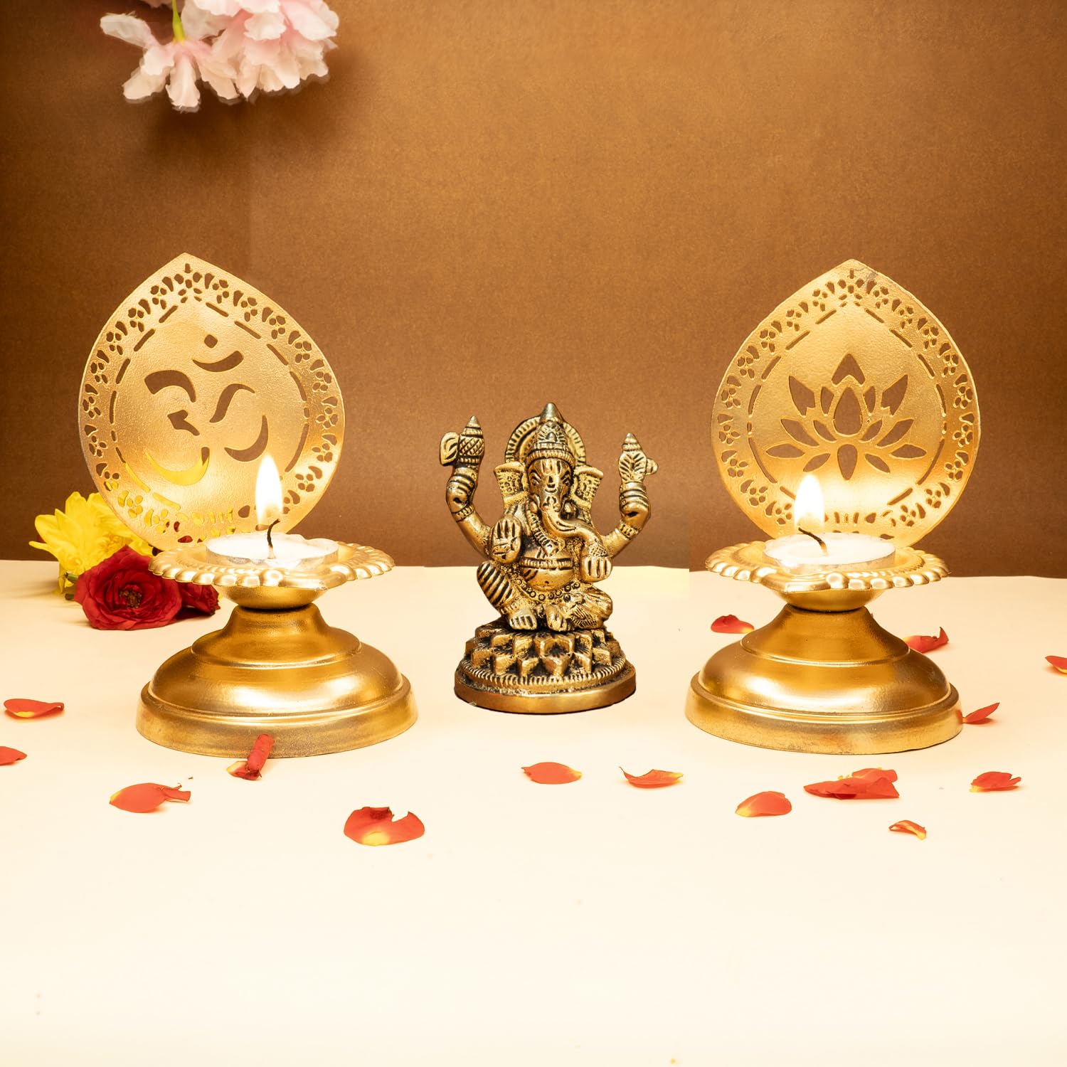 Ekhasa 100% Pure Brass Ganesha Idol & Tealight Candle Holder (Size: 8.4 cm) | Pital Ganesh Murti for Pooja Room, Home Decor, Office Desk, Car Dashboard | Vinayagar Statue for Diwali Puja (Combo Set)