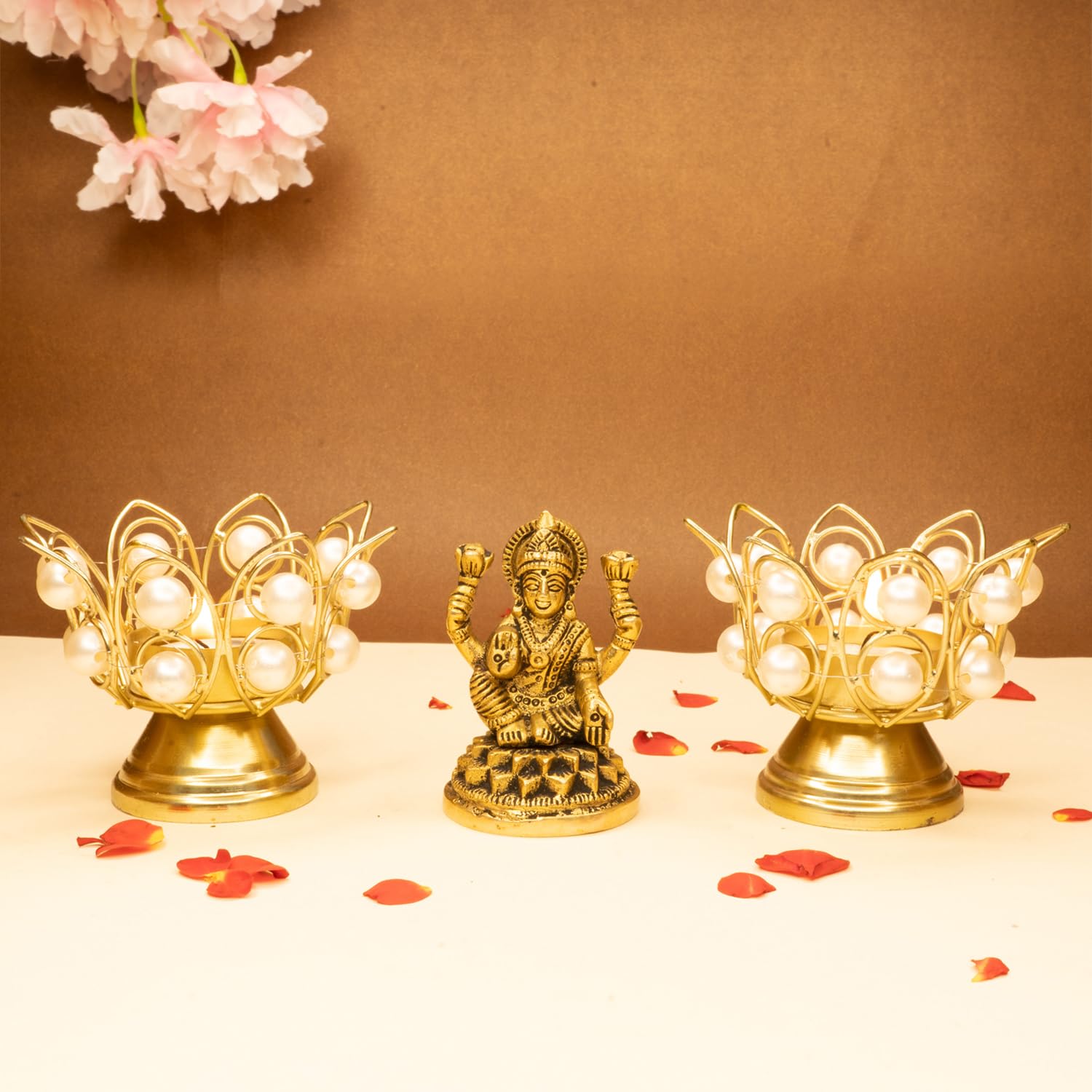 Ekhasa 100% Pure Brass Lakshmi Devi Idol & Tealight Candle Holder | Goddess Laxmi Idol for Pooja Room, Home Decor, Car Dashboard, Office Desk | Varalakshmi Puja Idol for Diwali (Combo)